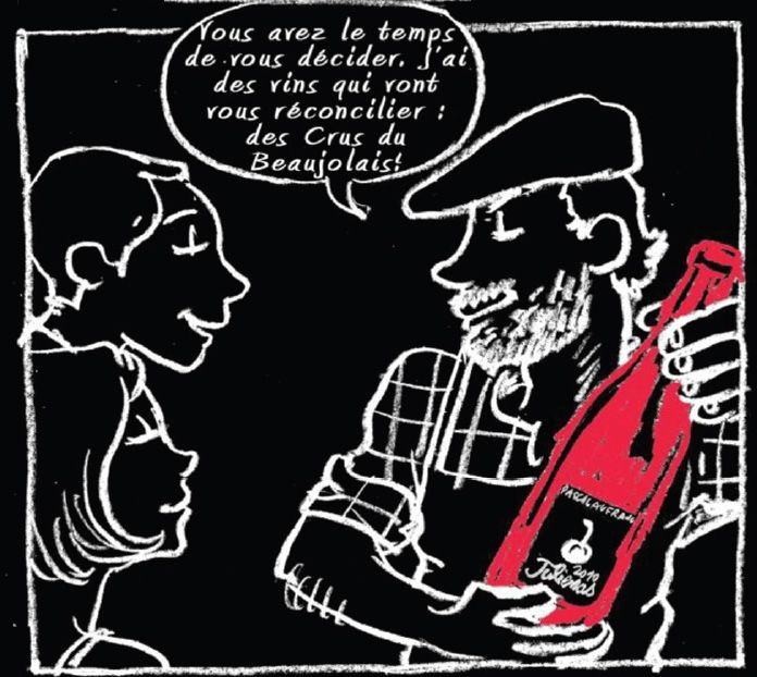 Ces 2 mêmes personnages, dessinés à la craie, sont aussi les vedettes d'une histoire courte sous forme de BD, actuellement présente dans la REVUE DU VIN DE FRANCE de Novembre. Ce sont les Crus du Beaujolais qui sont cette fois à l'honneur.